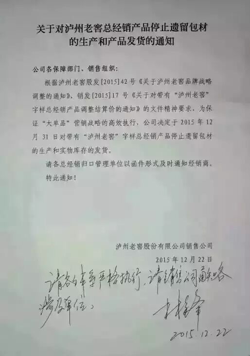 12月22日,泸州老窖股份有限公司销售公司在内部下发《关于对泸州老窖总经销产品停止遗留包材的生产和产品发货的通知》,通知称“为保证大单品营销战略的高效执行,公司决定于2015年12月31日对带有‘泸州老窖’字样总经销产品停止遗留包材的生产和实物库存的发货。”通知同时称,该决定将以信函形式及时通知经销商。