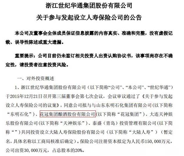 12月21日,花冠集团拟与其他4家公司发起设立“大陆人寿保险股份有限公司”(以下简称“大陆人寿”)(暂定名,具体名称以工商局核准后确定)。保险公司拟设于山东省菏泽市,注册资金拟定为人民币150,000万元,公司出资30,000万元,占总股份的20%。