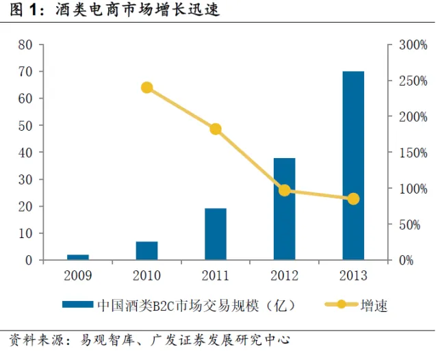 近年来食品饮料行业电商发展很迅速,2013年网购增速达48%。其中酒类电商2013年市场交易规模达到70亿,增速85%,高于食品行业整体网购增速。不过电商发展初期酒类电商经营品类中以葡萄酒为主流,因为葡萄酒价格不透明、品牌认知度低、线下分销体系不健全,线上发展得较快。