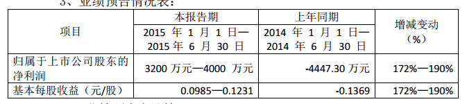 7月13日,酒鬼酒发布半年度业绩预告,报告显示2015年1月1日至2015年6月30日公司业绩扭亏为盈,归属于上市公司股东的净利润3200 万元—4000 万元,同比增长172%—190% 。而去年同期净利润为-4447.30 万元,从而可以看出,今年上半年较去年同期增长了7647.3万元至8447.3万元。本次业绩增长主要原因是营业收入与去年同期相比有较大幅度增长。