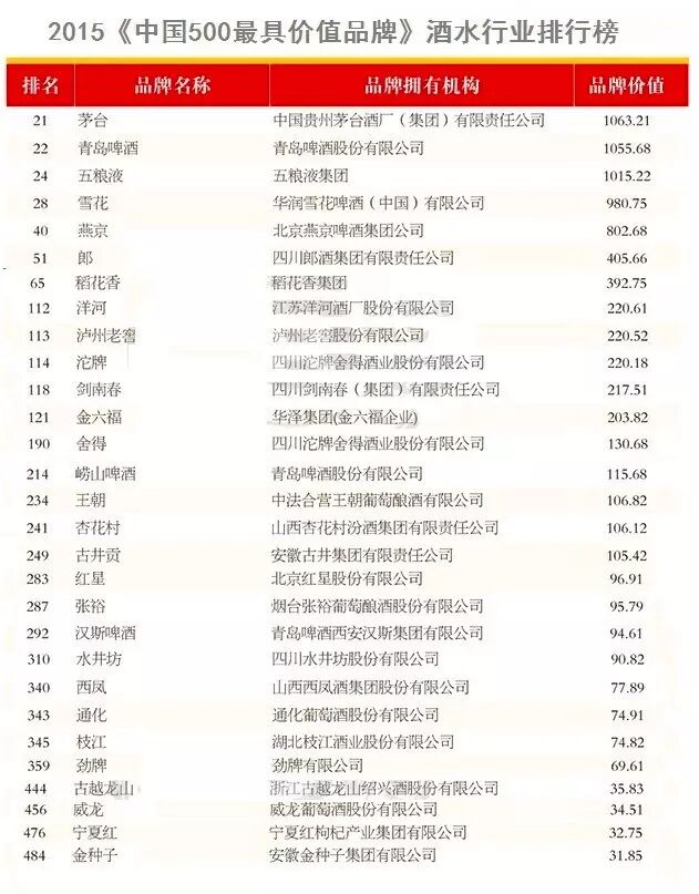 在查阅2014年12月15日发布的2014年(2015年排行榜要到今年12月底揭晓)《世界500最具价值品牌》排行榜中,仅青岛啤酒以350名的排名入选。中国白酒要想走向世界,获得世界的尊重、认可和喜欢,依然任重而道远!