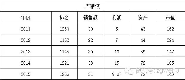 上述表中可以看出,五粮液今年的排名相比往年有所下滑,回归到2011年的1266名。此次下滑的原因可能与去年经营业绩下滑有很大关系。年报显示,公司去年实现营业收入210亿元,同比下跌15%;净利润58.35亿元,同比下跌26.81%;基本每股收益1.537元。下滑幅度相对较为大。