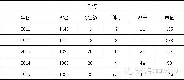 上表中可以看出,今年洋河的排名上升了58位,但也可以看出一个有意思的现象,洋河的销售额、利润、资产是一路上涨的,但是排名在去年却有所下滑,究竟是竞争太过激烈还是我们的进步空间有待提升呢。