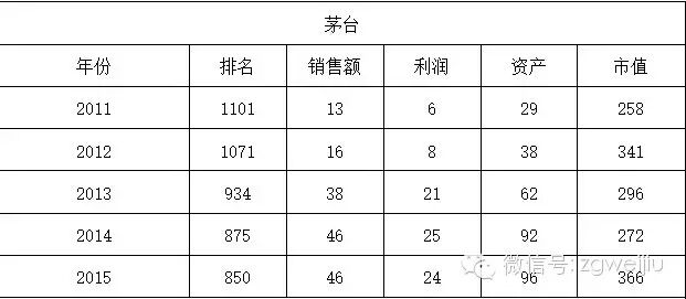 从上述列表中可以看出,茅台的排名一直不断的向前挺进,从1101名上升到850名,五年时间上升了251名,势头较好。而销售额、利润和资产也表现出不断上涨的迹象。市值在2013-2014年有些许下滑,但今年回升迅速。不愧是中国的国酒,当老大的还是比较强势!