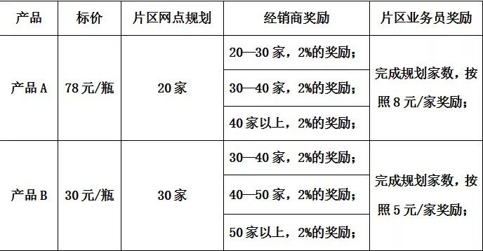 3)此外为了解决经销商及业务员铺货的积极性的问题,快速实现产品铺货,在将各产品规定的铺货家数分片区划分到责任业务员的同时,针对经销商可以给予网络建设奖(完成规定铺货网点数,分砍级按照回款金额给予奖励),针对业务员分产品按铺货家数给予现金奖励。
