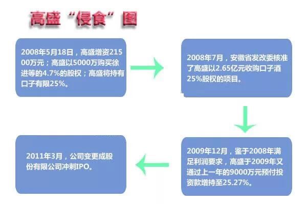 首先是高盛集团。2008年,口子酒业引进高盛作为投资者,之后高盛通过两次增资,投入3.55亿元获得了口子酒业25.27%的股份,成为第一大股东,蛰伏七年,高盛集团或将获利超过三倍。