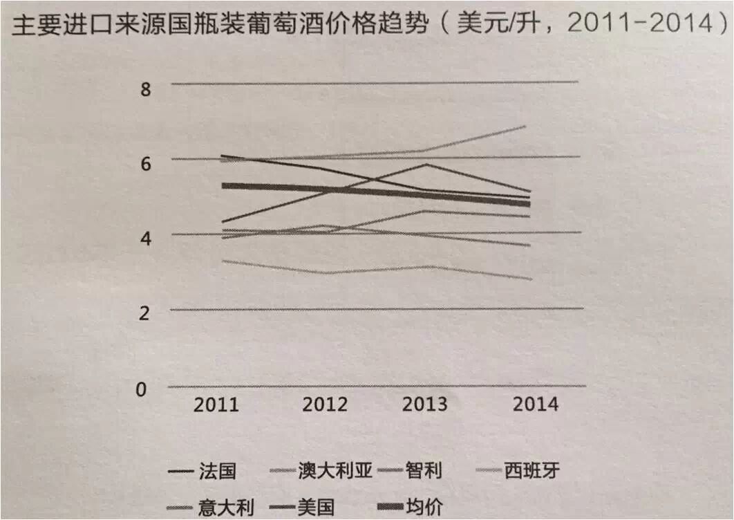 2014年进口散装葡萄酒总量约为8,188万升,同比(2013年散装葡萄酒的进口总量为8,,909万升)下降约8.09%;总额约为6.947万美元,同比(2014年散装葡萄酒的进口总额为10,781万美元)下降35.56%,平均价格为0.85美元/升。