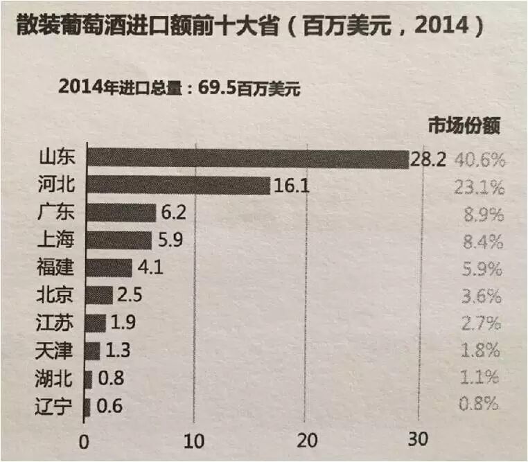 与2013年一样,山东、河北依旧是散装葡萄酒的消费进口大省。2014年进口散装葡萄酒总量为3,775万升,约占散装葡萄酒总量的46%,进口总额为2,821万美元,约占总额的41%。